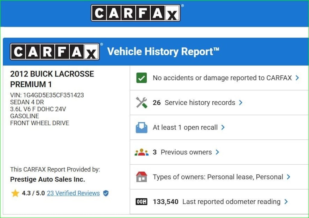 Recent Arrival! Carbon Black Metallic 2012 Buick LaCrosse Premium I Group Carfax 1-owner, No Accidents and # Service Records, Dove-Soft Leather Interior, Non-Smokers Vehicle, Cold A/C, Banks, Credit Unions, Lot Financing Available *, Carfax Certfied Dealer * Today's Manager Special!!, Market Retail Price $ (sale price is market-based offer),, Mechanical Service Contracts available from $395 (see dealer for details)..